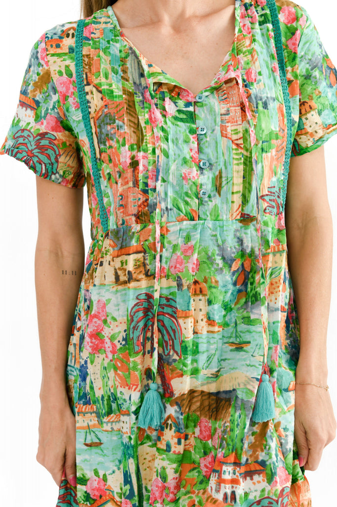 Breezy, elegant, and full of charm — the Colette V-Neck Tassel Dress is a standout piece. Crafted from 100% cotton, this knee-length dress features a flattering V-neckline, delicate tassel ties, and subtle button detailing that adds a hint of sophistication. With short sleeves and a relaxed silhouette, it’s perfect for warm-weather days or easy weekend outings. Style it with sandals or sneakers for a carefree yet polished look