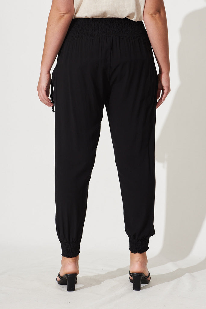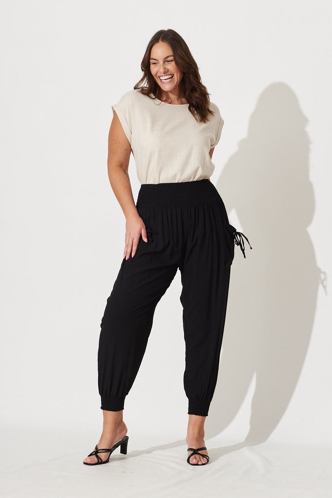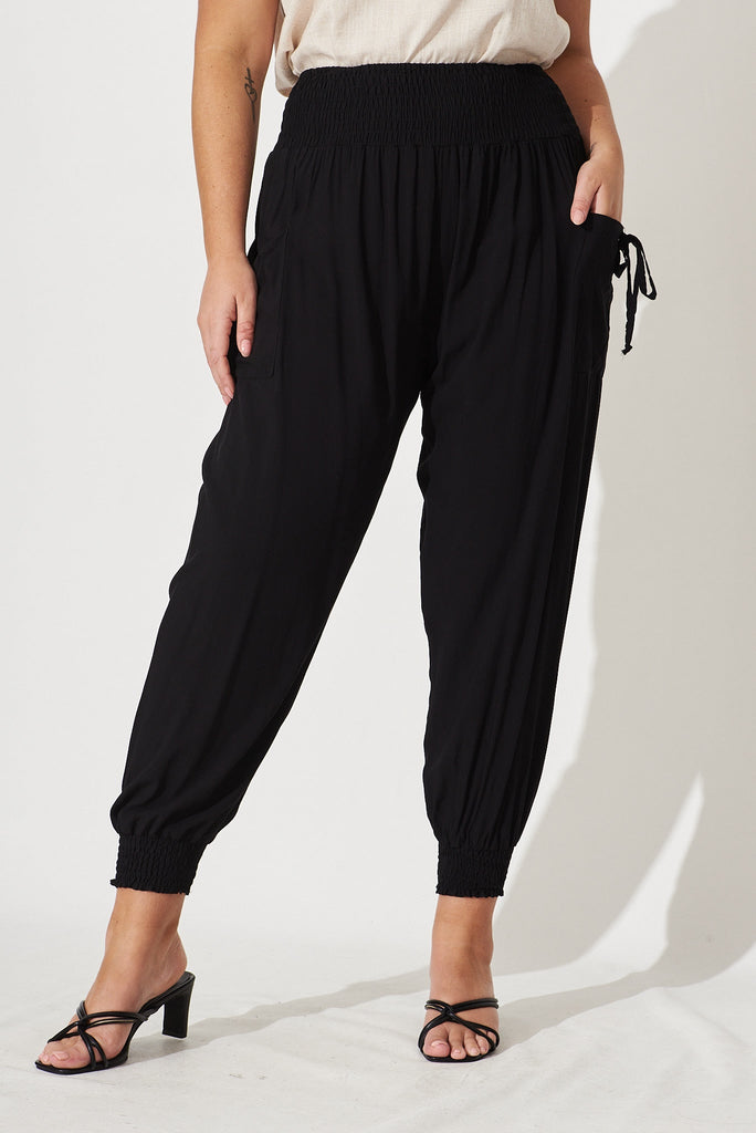 These stylish harem pants are a must have piece for summer styling. A shirred waistband ensures comfortable all-day wear. Elasticated leg cuffs create further shaping for that classic harem look. Easy to style with a fitted crop top or tucked in boxy T-shirt!