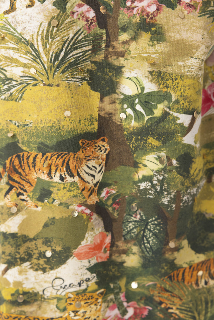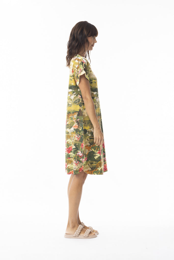Let your elegance bloom in the breathtaking Sia T-Shirt Dress, showcasing beautiful prints. This dress features comfortable short capped sleeves, a classic hemmed crew neckline, and a stylish side slit for a wonderfully relaxed fit, designed for effortless beauty.