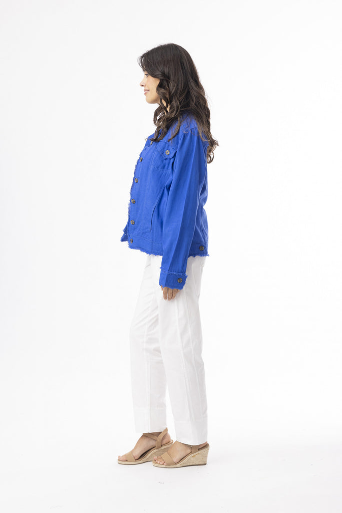 Step into summer with our Linen Blend Jacket, the perfect solution to summer layering. Featuring stylish frayed trim and front bust pockets, this jacket combines casual elegance with practical design. Perfect for layering, it offers both comfort and chic appeal, making it a versatile addition to any outfit.